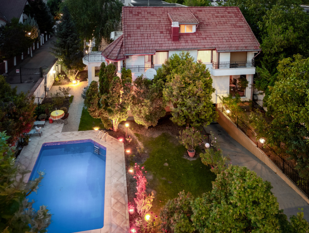 PREȚ NOU: 950.000 EUR | În zona Erou Iancu Nicolae, una dintre cele mai căutate zone rezidențiale din nordul Bucureștiului, vă propunem spre vânzare o vilă individuală spațioasă, cu piscină, zonă de relaxare și teren generos, ideală pentru o familie care își dorește confort, intimitate și acces rapid la școli internaționale. Proprietatea este dezvoltată pe demisol + parter + etaj + mansardă, are 8 camere, o suprafață utilă de aproximativ 334 mp și un teren de 670 mp, cu curte amenajată și piscină exterioară încălzită. Compartimentare și funcționalitate Parter: living mare și luminos, cu șemineu și zonă de dining, bucătărie deschisă, modernă, cu acces către terasă și curte Etaj: dormitoare spațioase, bine luminate, băi amenajate funcțional, spații de depozitare Mansardă: spațiu ideal pentru birou, hobby room sau cameră de oaspeți, cu saună uscată Demisol: cramă, sală de fitness, saună umedă, cameră tehnică, spații de depozitare și garaj subteran Curte, piscină și dotări piscină exterioară încălzită, utilizabilă pe un sezon extins curte amenajată, aspersoare și puț propriu pentru irigare garaj electric subteran + 4 locuri de parcare exterioare porți auto automatizate, gard de zidărie pentru intimitate Dotări tehnice și de siguranță: generator electric de 9 kW cu pornire automată rulouri electrice cu telecomandă sistem de supraveghere video perimetral sistem de alarmă interior cu senzori de mișcare sistem de irigații cu programare automată video-interfon la acces pietonal scări placate cu granit, acoperiș cu țiglă de calitate două aparate de aer condiționat Locație – Erou Iancu Nicolae Vila este situată pe Erou Iancu Nicolae, zonă apreciată de familii și expați pentru: proximitatea față de British School of Bucharest (BSB), American International School of Bucharest (AISB) și Mark Twain International School accesul rapid către zona de birouri Pipera–Aviației–Floreasca restaurante, cafenele, clinici private, centre comerciale și spații de recreere în apropiere Preț și condiții PREȚ NOU: 950.000 EUR Proprietatea este potrivită pentru o familie care își dorește o casă în care să aibă și spațiu, și curte cu piscină, și facilități de relaxare (saună, sală de fitness, cramă), într-o locație foarte bună în nordul Bucureștiului. Id intern: 0352