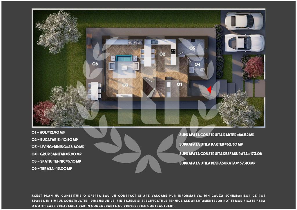 Direct Proprietar FĂRĂ TVA COMISION 0 ???????????????????? ???????????????????? ???????????????????????? este un proiect format din 3 case cubice, construite într-un stil modern și elegant. Unul dintre avantajele specifice acestui complex este faptul că este situat într-o zona liniștita și verde din Nordul orașului București, în intravilanul localității Tunari pe ????????????. ???????????????????????????? ????????. ????. Casele din acest ansamblu sunt proiectate pentru a oferi un confortul zilnic atât de necesar, cu suprafețe spațioase și finisaje de cea mai înalta calitate. Proiectul este unul modern, arhitectură caselor de tip cub fiind ceea mai eficientă soluție în exploatarea spațiului interior și exterior. Fiecare vila cu regim de înălțime P+1E are suprafața construită 173 mp, iar suprafața utilă 155 mp și o curte generoasă. Terenul aferent de 350 mp, în cadrul căruia se dispune de o curte liberă de peste 260 mp, o terasă de 13 mp și cele 2 parcări care sunt amplasate în zona de acces a vilelor, această poziționare neafectând curtea destinată activităților familiale și relaxării. Parterul casei dispune de o zona foarte modern amenajată destinată pentru living și dinning 26,60 mp, o bucătărie spațioasă echipată cu dotări de calitate 10,80 mp, un grup sanitar 3,90 mp și un spațiu tehnic de 5,10 mp. Accesul către acestea se face dintr-un hol de 12,90 mp. Din cadrul parterului face parte și terasă de 13,00 mp, special gândită pentru a fi un spațiu de relaxare. Suprafață totală construită a parterului este de 86,52 mp, cea utilă fiind de 62,30 mp. Etajul 1 dispune de 3 dormitoare, 2 dormitoare alăturate de 13 mp fiecare care au acces către un balcon generos de 7,39 mp și cel matrimonial dotat cu un dressing (zona 3) și cu grup sanitar propriu de 4,69 mp. Accesul către dormitoare se face dintr-un hol de 5,40 mp. La etajul 1 mai este un grup sanitare pentru a deservi cele două dormitoare. Suprafață totală construită a etajului 1 este de 86,52 mp, cea utilă fiind de 75,10 mp. Pentru un viitor lipsit de griji, in confort si siguranță, Cubic House Tunari a fost proiectat in cel mai mic detaliu: instalații si finisaje Premium; energie alternativa; încălzire în pardoseală; structura de rezistenta din beton armat; compartimentarea executata din cărămidă; tâmplărie termopan de calitate superioară, totul la prețuri avantajoase. Infrastructura complexului este dezvoltata, oferind toate facilitățile necesare pentru un trai modern și confortabil. Cubic House Tunari oferă toate utilitățile necesare. Cubic House Tunari este amplasat într-o zona cu cu acces facil la mijloacele de transport in comun, centre comerciale, scoli sau grădinițe, locuri de joacă și zone de agrement. Cubic House Tunari reprezintă oportunitatea de a locui într-un ansamblu modern și bine conectat, situat într-un mediu liniștit si verde. Vastă experiență a constructorului în domeniul dezvoltării locuințelor a dus la maximilizarea calității în implementarea proiectului.