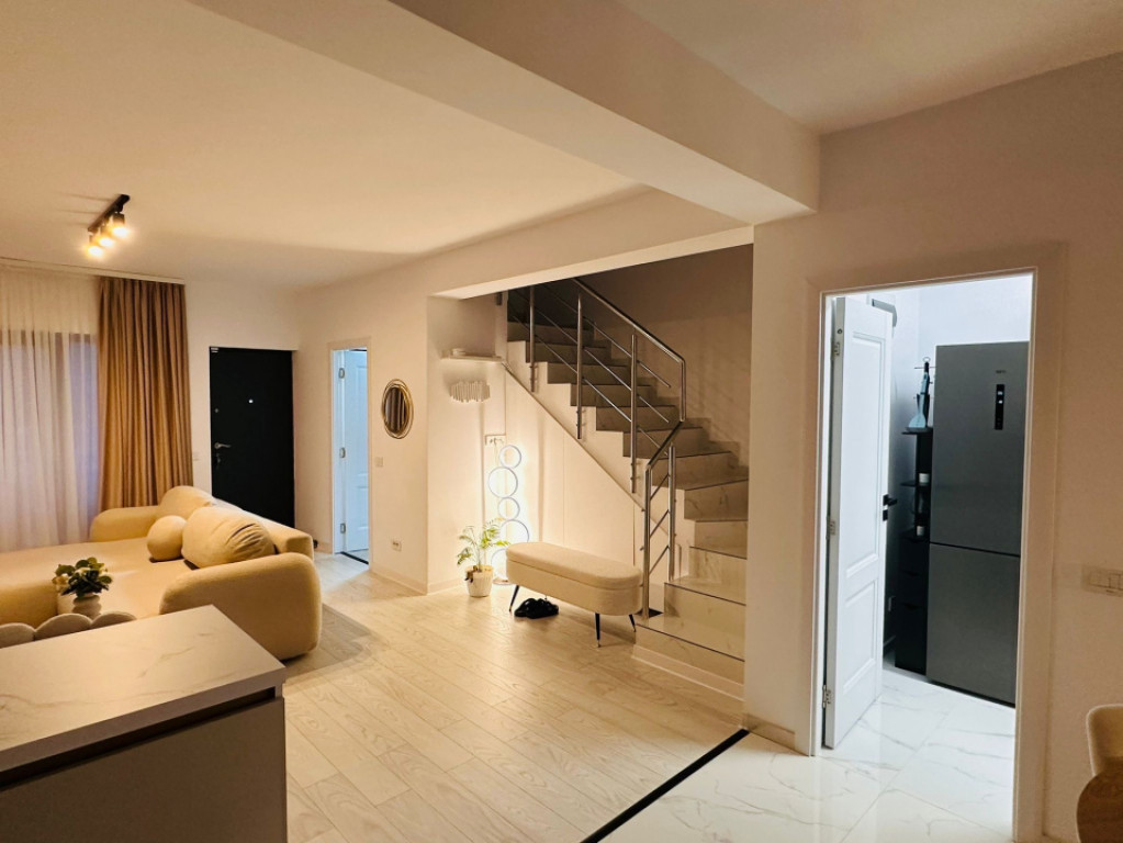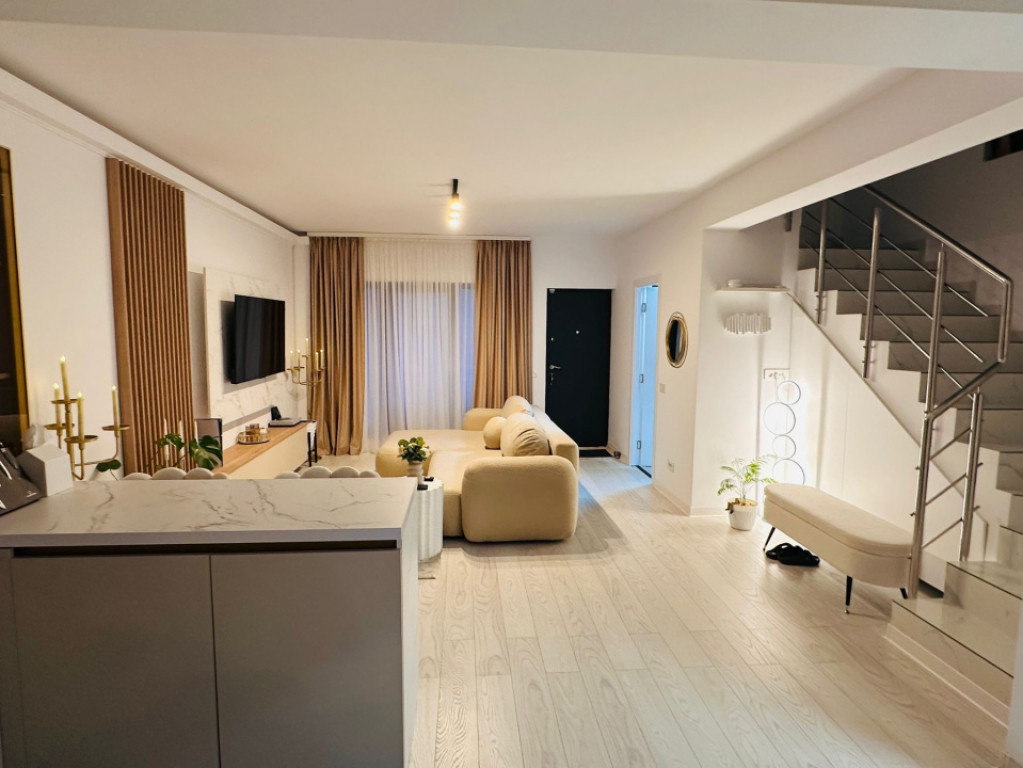 De vanzare vila insiruita premium, complet finisata, mobilata si utilata ultra lux, construita in anul 2024, avand o suprafata construita de 138 mp, suprafata utila de 113 mp, teren de 169 mp, amprenta la sol de 69 mp si curte libera de aproximativ 100 mp. Proprietatea este compartimentata eficient si inteligent, oferind la parter un living generos cu zona de dining si bucatarie open space, baie si camera tehnica. La etaj se regasesc 3 dormitoare luminoase si o baie spatioasa. Deasupra etajului exista placa de beton si pod destinat depozitarii. Vila este construita pe cadre de beton, cu zidarie din caramida Porotherm, izolatie exterioara de 10 cm din polistiren expandat, tamplarie VEKA cu geam tripan si acoperis Lindab. Podul este foarte bine izolat cu spuma cu celula inchisa, contribuind semnificativ la eficienta energetica a locuintei. Casa dispune de centrala termica proprie Ariston si incalzire in pardoseala pe ambele etaje, ceea ce asigura un confort sporit si costuri reduse de intretinere. Proprietatea beneficiaza de toate utilitatile: gaz, curent, apa si canalizare. Amenajarea interioara este realizata cu mult bun gust, folosind materiale premium din import, mobilier modern de foarte buna calitate si multiple automatizari care sporesc confortul zilnic. Bucataria este complet mobilata si utilata premium, cu electrocasnice AEG de ultima generatie. In camera tehnica se regasesc masina de spalat rufe si uscator AEG. Curtea este impartita practic in doua zone: in partea din fata se afla aproximativ 70 mp, cu terasa deschisa si loc de parcare, iar in partea din spate aproximativ 30 mp, amenajati cu terasa, gratar, pergola si spatii de depozitare. Aceasta vila impresioneaza prin calitatea constructiei, atentia la detalii, designul modern si nivelul ridicat de confort, fiind alegerea ideala pentru cei care isi doresc o locuinta premium, complet pregatita pentru mutare. Pret de vanzare: 179.000 Euro, usor negociabil. La pretul afisat nu se adauga TVA. Oferim GRATUIT consultanță și suport în vederea identificării celor mai potrivite soluții de finanțare, în baza unor parteneriate cu cei mai importanți brokeri financiari. Oferta apartine in exclusivitate agentiei EBA Real Estate Id intern: P253427