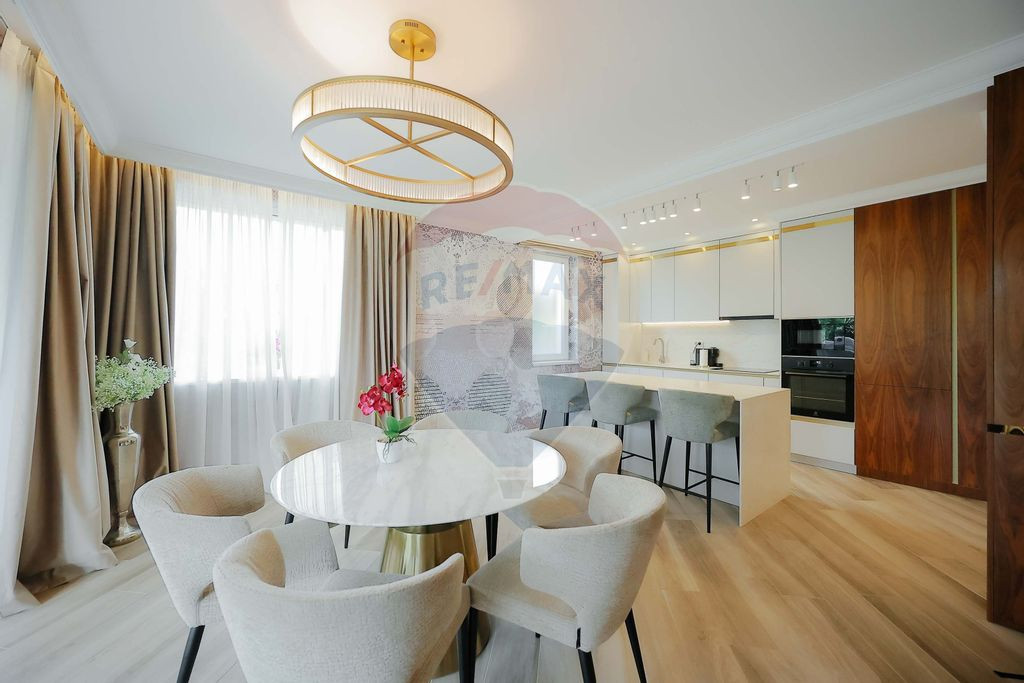 Zona de dining și bucătăria open-space comunică perfect cu terasa exterioară prin suprafețele vitrate ample, oferind o legătură naturală între interior și grădină. Aceasta este dotată cu electrocasnice de ultimă generație, o insulă centrală elegantă, perfectă pentru mic-dejun sau socializare.