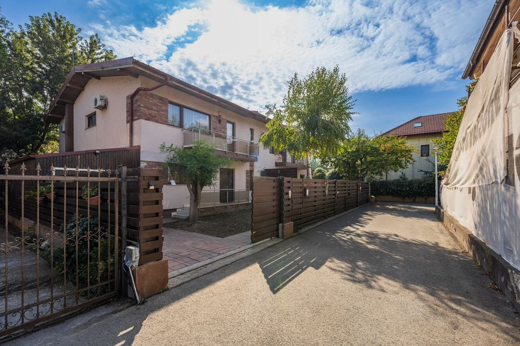 Descoperă un nou nivel de confort și rafinament într-o locuință situată în inima unei comunități selecte – Complexul Enculescu, Dobroești. Această proprietate deosebită este amplasată pe strada Nicolae Bălcescu, într-un complex privat, complet locuit, recunoscut pentru comunitatea sa unită și prietenoasă, aleile asfaltate și atmosfera liniștită. Regim de înălțime: Parter + Etaj (P+1) Suprafață construită: 200 mp Suprafață utilă: 161 mp Garaj pentru 2 mașini + 1 loc de parcare în curte Pod/spațiu de depozitare Centrală proprie în condensație și contorizare separată Bucătărie spațioasă și închisă Compartimentare funcțională: Parter: living generos, bucătărie închisă, baie, birou/dormitor de oaspeți, spații de depozitare Etaj: în configurația actuală sunt două dormitoare foarte mari, ambele mobilate, și două băi. Inițial, la etaj au fost trei dormitoare, iar compartimentarea se poate reface foarte ușor dacă se dorește încă o cameră suplimentară. Pardoseli din piatră naturală / granit Parchet din lemn masiv Băi complet mobilate și utilate Proprietatea oferă un echilibru ideal între funcționalitate, estetică și calitate, fiind perfectă pentru familii sau persoane care caută un cămin într-o zonă sigură, liniștită și exclusivistă. Poziționată într-o comunitate bine închegată, complexul oferă intimitate, vecini deosebiți și un stil de viață aparte, într-un cadru modern și bine organizat.