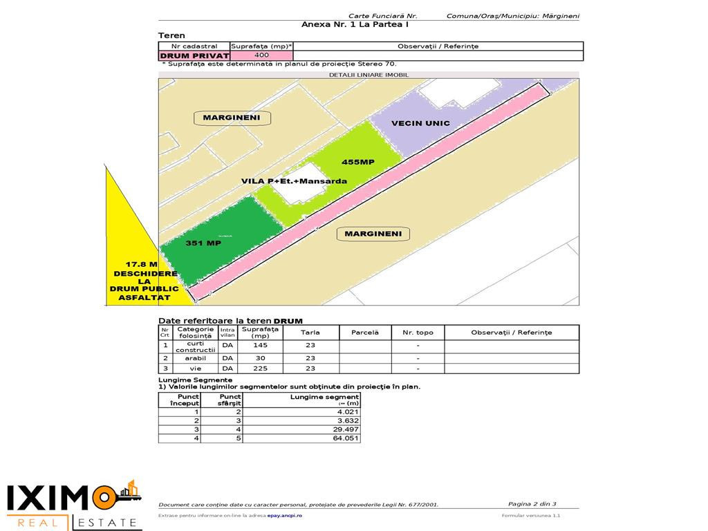 IXIMO Agentie Imobiliara va propune- acum cu pret redus pana pe 10 Decembrie 2025 -in reprezentare exclusiva spre vanzare o Vila Individuala Curte Proprie[an 2019] in zona Calea Moinesti - Bacau -DAR APARTINAND DE COM.MARGINENI /ORICE Autorizare se face MULT mai simplu !!!!!!- avand 5 camere, 4 dormitoare,4 bai cu o suprafata totala construita de 247 mp si o suprafata utila de aprox. 210 mp. Situata Direct Stradal[excelent vad plus vizibilitate pentru servicii de orice tip] cu o Suprafata teren totala de 1000 mp[800 mp teren parcelabil exclusiv plus 200mp Drum PRIVAT -DIRECT DIN ASFALT!!!] si o Deschidere de 16 ml la strada intens circulata !!! Imobilul P Etaj[4 camere,3 balcoane,2 bai] Mansarda[spatiu complet deschis dotat cu grup sanitar ] are o amprenta 87 mpconstruiti la sol si o curte individuala libera de cca.900 mp.Avand structura din caramida Porotherm cu planseu de beton armat peste parter[living open space,bucatarie inchisa,grup sanitar dublu,spatiu tehnic] vila este construita de catre Proprietar pentru uz personal, avand acoperis tip Lindab,Izolatie Exterioara de tip termosistem 10 cm,CT Gaz,tamplarie PVC cu geam termopan,apa si canalizare racordate la reteaua publica,curent . Pretabil locuinta, birou, locuinta/birou, spatiu comercial . ID intern: 380.