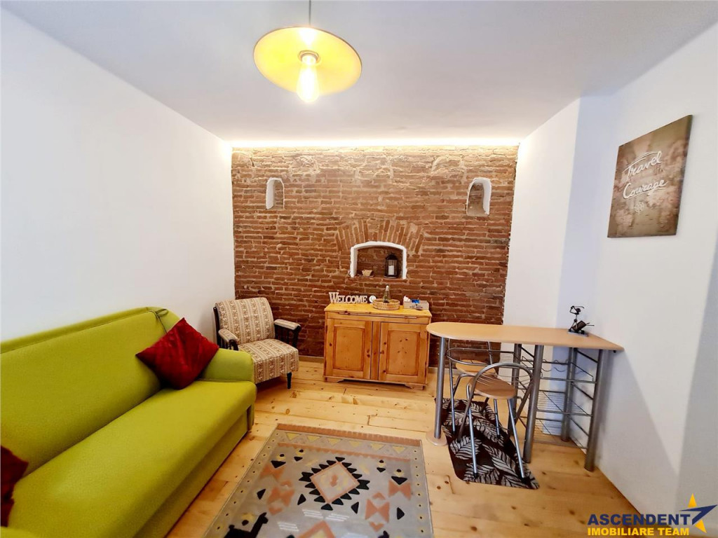 Comision cumparator: 2% TVA, din valoarea de tranzactionare. Ascendent Imobiliare va prezinta un apartament pozitionat excelent in zona centrala a orasului Brasov. Proprietatea complet renovata are o nota vintage, data de designul de interior, astfel incat se armonizeaza perfect cu cladirile istorice ale centrului Brasov. Cu o structura semidecomandata, avem urmatoarea configuratie: - living cu zona de dinning, hol, dormitor matrimonial, bucatarie micuta complet echipata, baie cu cada Este o proprietate cocheta, pe un nivel inalt de parter, care poate fi preluata imediat pe segmentul investitional sau in care va puteti muta rapid fara sa necesite renovari. Rezidenta cu sistem de alarma pe senzori. Curtea este comuna, dar extrem de generoasa si spatioasa. Beneficiati de loc de parcare in curtea interioara. Are posibilitatea de extindere mansarda. Proprietatea se preda complet mobilata si utilta. Accesul este facil catre toate punctele de interes, statie RAT in proximitate, la 5 minute distanta de centrul istoric. Forma de plata: achizitie cu plata cash(prin transfer bancar) Consultant specializat pe oferta: doamna Gilda Georgescu Tel/Whapp 0722 807 623 Detalii, fotografii suplimentare si alte oferte similare exclusive: www.ascendentimobiliare.ro