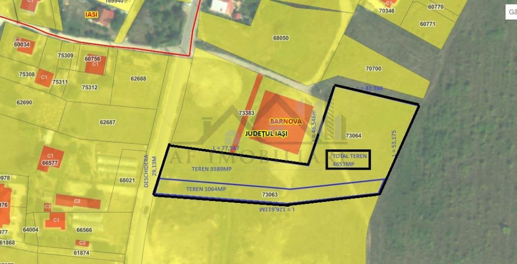 Ag. A.F.Imobiliare va propune spre vanzare un teren intravilan in suprafata de 4653mp cu deschidere la str. Principala de 29m la capatul opus 53m.