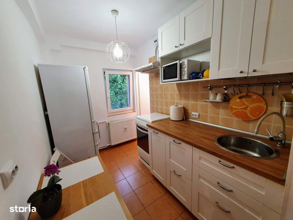 apartament decomandat cu o cameră în București, sector 3, vis-a-vis de București Mall, în zonă liniștită, verde, cu locuri de parcare disponibile, la etajul 4/4 al unui bloc mixt. Apartamentul este mobilat și utilat, dotat cu ușă metalică, combină frigorifică, mașînă de spălat rufe, cuptor electric, aer condiționat, cuptor cu microunde, TV, filtru de cafea. Are debara, camară și balcon inclus în spațiul de locuit. Zona este ușor accesibilă, având în vecinătate metrou (Timpuri Noi, Mihai Bavu), tramvai, autobuze, magazine, piață, restaurante, cinema. Disponibil imediat pentru vizionare.