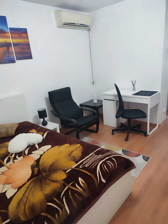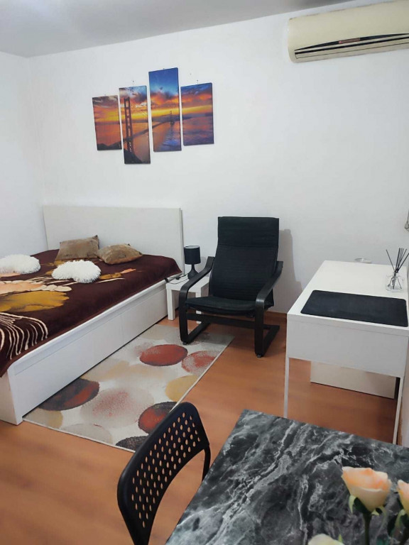 garsoniera renovata in 2025, complet utilata. Se compune din: - hol (gresie) cu spatiu de depozitare - baie (gresie/faianta) cu cada, apometre si masina de spalat - sufragerie si dormitor in camera principala: parchet laminat, pat 160/200, birou, dulapuri, masa cu 4 scaune, climatizor. - bucatarie decomandata utilata: mobila, aragaz, cuptor cu microunde, masina cafea. - balcon inchis cu geamuri termopan. Frigider. Garsoniera este la etajul 4 intr-un bloc cu 10 etaje care se afla la 30m de statia Stadion Olimpia (autobuze:123 si 135). Blocul are interfon, usa termopan, 2 lifturi, supraveghere camere, incalzire centralizata. Nu fumatori si nici animale de companie.
