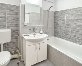 - Bucataria, inchisa, fiind mobilata, dotata si avand, totodata, acces catre balcon;