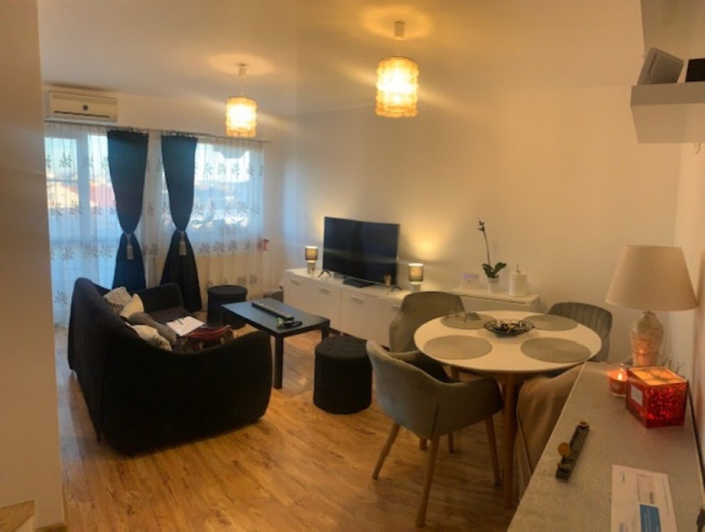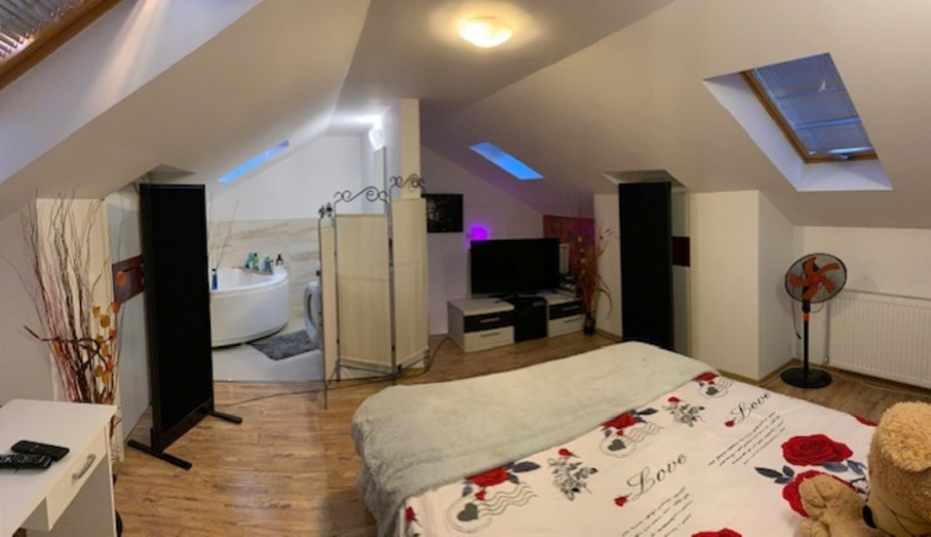 Imobiliare PrimaCasa va ofera spre vanzare un apartament pe 2 nivele finisat mobilat si utilat modern. Apartamentul se afla intr-un ansamblu rezidential cu P+2 etaje +M facut aprox in anul 2008. Apartamentul are microcentrala Ariston, aer conditionat, gresie, faianta, parchet, izolatie exterioara si se compune la primul nivel din : -un hol de intrare, living cu bucatarie openspace, 1dormitor , o baie si o terasa. La mansarda (nivel2) se compune dintr-un dormitor si debarale in lateral , o baie cu vana pe colt! Apartamentul se preda conform pozelor facute!